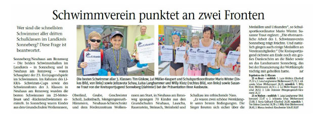 Er überreichte dem Schwimmverein eine Spende, worüber sich dessen Mitglieder sehr freuten. Das SonneBad hatte die Veranstalter des Contests sehr gut unterstützt, alles war perfekt organisiert und vorbereitet. Die etwa 60 aktiven Mitglieder zeigten in den Disziplinen 50 bis 100 Meter Brust und 50 bis 100 Meter Rücken ihr Können. Im Abschluss daran konnten die einzelnen Trainingsgruppen noch bei zwei Staffeln ihr Können unter Beweis stellen. Die Landtagsabgeordnete Beate Meißner unterstützte die Veranstalter bei der Siegerehrung und übergab die Medaillen. Für die Verpflegung wurde auch bestens gesorgt. Fleißige Helfer bereiteten leckere Fruchtspieße zu, die von den Kindern in den Pausen verzehrt werden konnten. Es gab hervorragende Unterstützung von Eltern und Großeltern, die dazu beitrugen, dass zum Beispiel die Urkunden geschrieben und das die Zeiten gestoppt wurden. An alle nochmals ein herzliches Danke schön. Die Atmosphäre im SonneBad hätte nicht besser sein können. Es war ein großartiges Event, dass der 1. Schwimmverein Sonneberg e.V. bestimmt wiederholt.