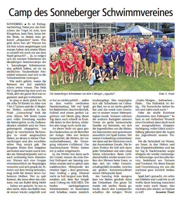 Der 1. Schwimmverein Sonneberg e.V. veranstaltete vom 04.07.2014 bis zum 06.07.2014 das 3. Schwimmcamp im Schullandheim Schirnrod. Der Freitagnachmittag startete für die 51 Kinder und Jugendliche und 9 Betreuer mit herrlichem Sommerwetter und super guter Laune. Pünktlich zum Anpfiff des Fußballspieles der deutschen Nationalmannschaft konnten die Interessierten das Spiel auf einer großen Leinwand verfolgen.